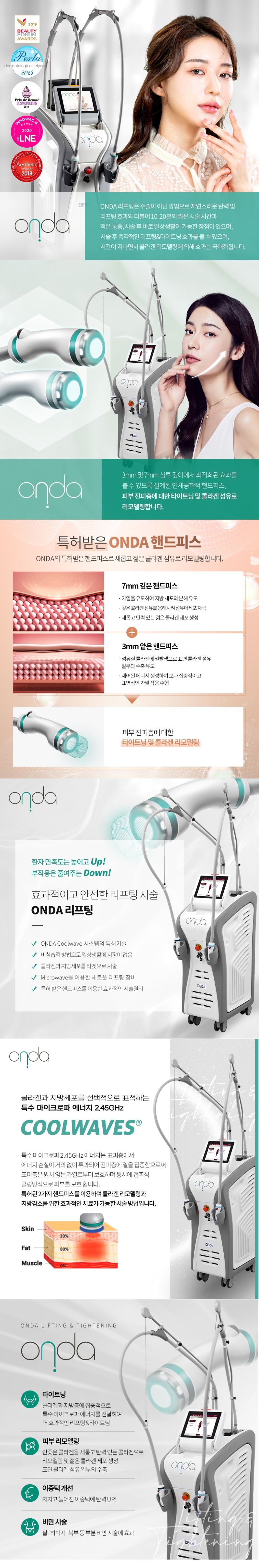 *온다는 혁신적인 Coolwaves 기술을 통해 극초단파 레이저로 피부를 타이트하게 만들고, 처진 피부를 리프팅하는 데 도움을 주는 시술입니다. 시술 후 즉각적인 효과를 기대할 수 있으며, 시간이 지나면서 콜라겐 리모델링 효과로 피부 질감이 더욱 개선됩니다.1만줄(10kj)
